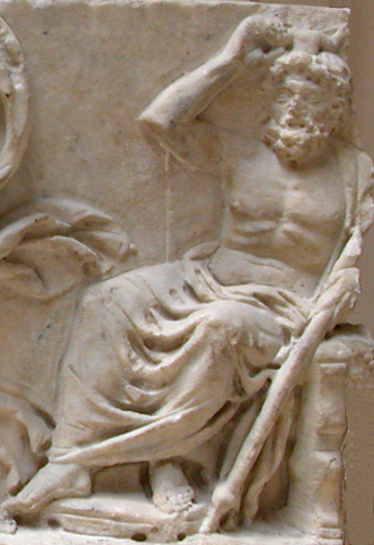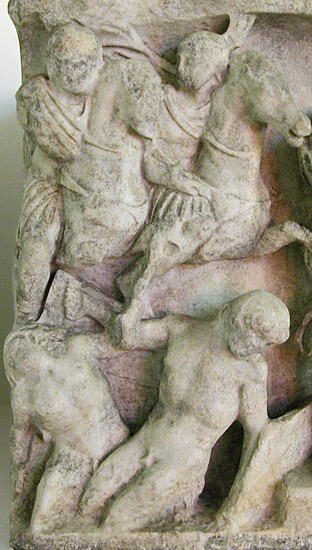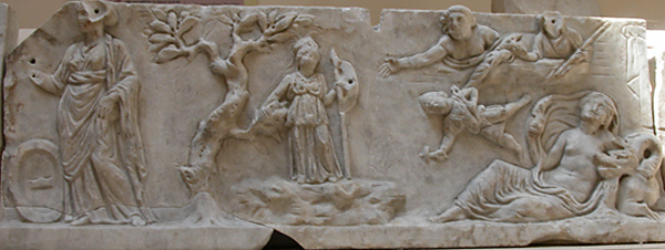 Luna marble frieze from the Temple of Vulcan/Hephaestus narrating the myth of the life of the god of fire; only 4 blocks remain, running right to left.