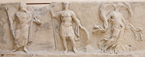 A representation of the central pediment of the Temple of Jupiter Optimus Maximus (the only 3-dimensional one known of the Temple from the post-80 CE fire) with 3 differences: the position of Juno and Minerva are reversed, all three gods sit on one throne, the birds of the goddesses are present. From Guidonia near Rome (Palestrina Archaeological Museum). Special exhibit: Divus Vespasianus at the Capitoline museums. 2nd century CE. Credits: Ann Raia, 2009.