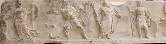 Scene 1: Birth of Athena from the head of Zeus, from which Ilithyia, goddess of childbirth, flees. Scene 2: After the birth of Vulcan, his mother Juno/Hera watches him walk awkwardly. Scene 3: Juno throws the child Vulcan, dressed as a craftsman in short tunic and cap holding his tools, from Olympus; Athena awaits him on Lemnos. Scene 4: Gathering of the gods: Athena and others, Poseidon and others, at the birth of Erechthonios (snake), child of Vulcan and Gaia; he is sent to be nurtured by Athena who awaits him beside her olive tree. 2nd century CE. Ostia Museum and Berlin Museum. Credits: Ann Raia, 2007.