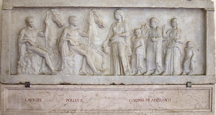 Castor, Pollux and a procession of worshippers led by a priestess.