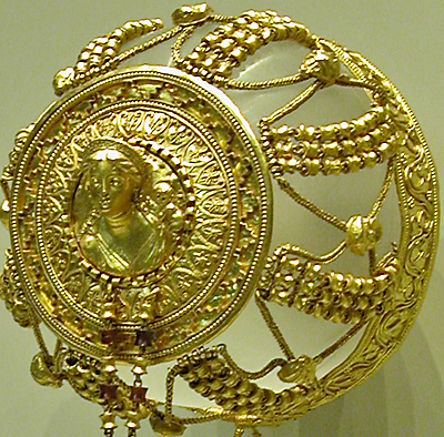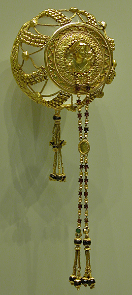 The hairnet was made to cover a bun in back of the head, with a bust of a crowned woman in the center and pendent tassels of gold and gemstones. Probably owned by a wealthy Ptolemaic noblewoman, it belongs to an ensemble that includes the diadem and other gold jewelry. Greek, from Alexandria, Egypt, 220-100 BCE. Malibu, J. Paul Getty Museum. Credits: Ann Raia, 2009.