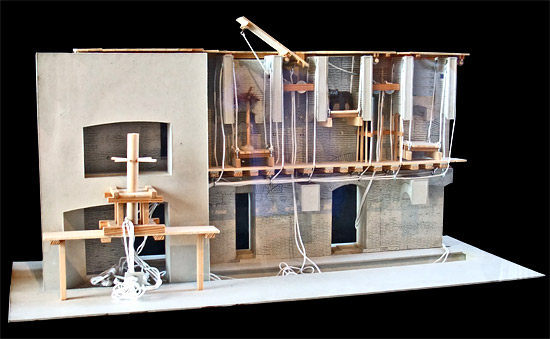 The model shows the way in which cages for animals and lifts for scenery were raised toward trapdoors in the floor of the arena during the late Flavian period, using a system of ropes, winches, counter-weights, and ramps.