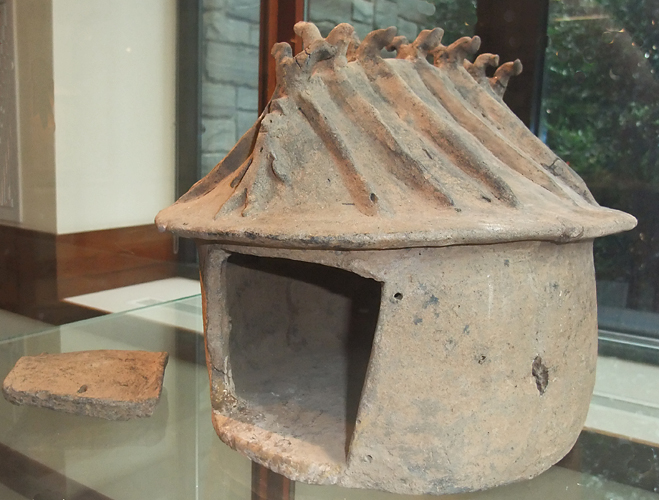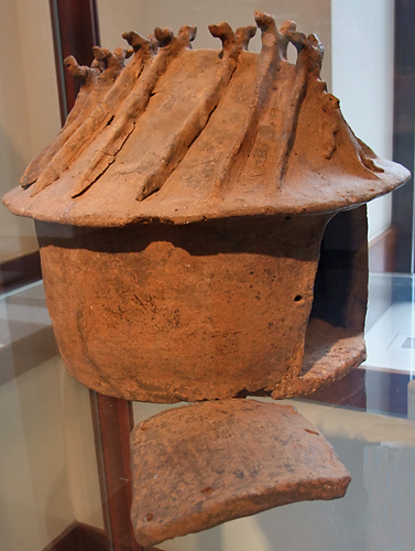 This Villanovan urn for cremated ashes is elliptical, like the huts on the Palatine Hill in Rome. It has a conical roof with ridgepoles; the door has been removed. The stick figure over the entry (side 1, side 2) may have been intended to protect the soul of the deceased.