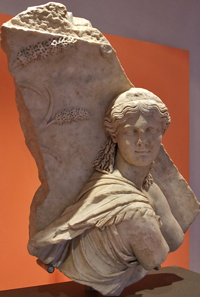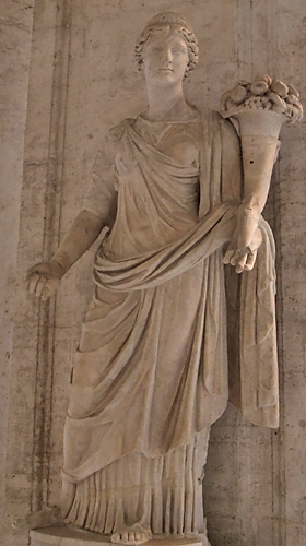 The draped woman holds a cornucopia, sign of fertility and prosperity. She may once also have held a garland. The head is crowned, clearly a portrait. 2nd century CE. Rome, Capitoline Museums. Credits: Ann Raia, 2009.