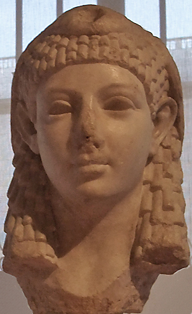 Bust of a woman: marble This portrait of a mature woman of the elite class may be of Domitia, wife of Domitian. Her hairstyle (side view) was popular during the Flavian/Trajanic period (69-117 CE). The nose, tip of hair, and drapery have been restored.