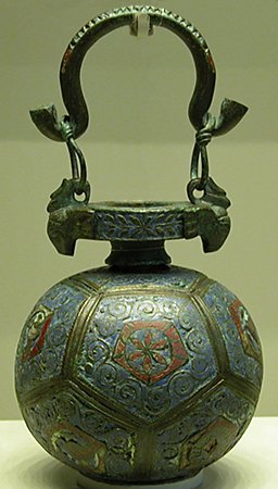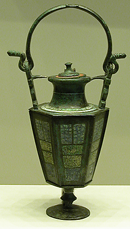 Container made of hexagonal glass mosaic panels, with a handle, for cosmetics. Gallo-Roman, 200-250 CE. Malibu, J. Paul Getty Museum. Credits: Ann Raia, 2009.