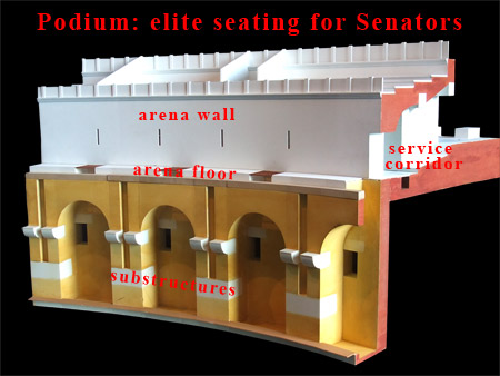 View looking toward the eastern entrance, showing the wide central corridor and series of concentric corridors under the arena floor, which was made of wood covered with sand.