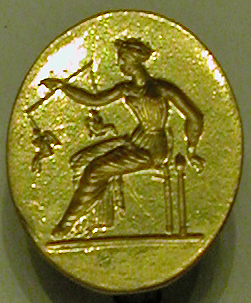 Seated, the goddess holds a scale on either pendant of which is a figure of Eros, the winged god of love. Greek, c. 350 BCE. Malibu, J. Paul Getty Museum. Credits: Ann Raia, 2009.