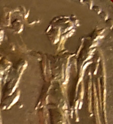 emperor standing holding a spear and short, sheathed sword; a winged Victory, holding a palm branch in her left
