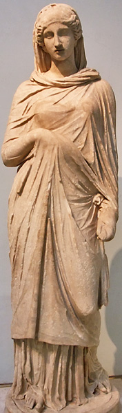 Full-length statue of a veiled young woman holding a scroll, enveloped in her cloak and veiled. The head is a portrait of Augustus' sister Octavia. Late 1st century BCE. Naples: Archaeological Museum. Credits: Ann Raia, 2009.