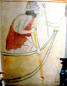 Charon, is the ferryman of the dead in Greek mythology. Hermes brings the souls of those who have died to him, and Charon ferries them across the river Acheron. He only accepts the dead who are buried or burned with the proper rites, and that pay him for their passage. For this reason the Greeks always placed a coin under the tongue of the deceased.
