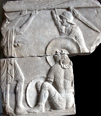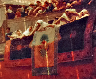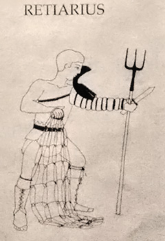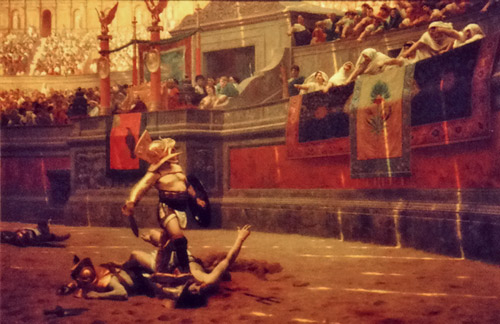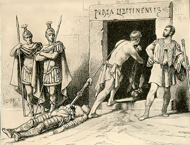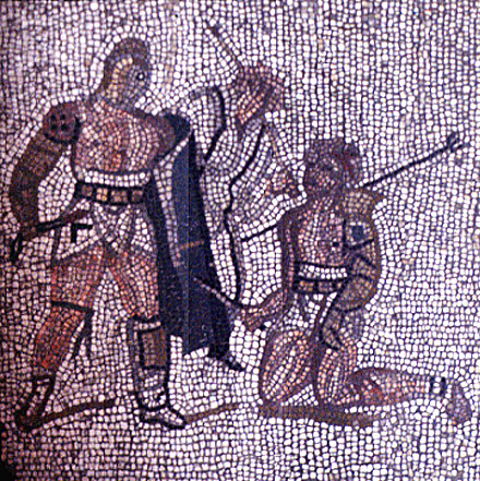 In the afternoon came the high point of the gamesindividual gladiatorial combats. These were usually matches between gladiators with different types of armor and fighting styles, supervised by a referee carrying a long staff (summa rudis). Although it is popularly believed that these bouts began with the gladiators saying Those who are about to die salute you, the only evidence for this phrase is only found in the description of a naumachia staged by Claudius using condemned criminals, where the men supposedly said Ave, imperator; morituri te salutant (Suetonius, Claudius 21.6). This was certainly not a typical gladiatorial combat and cannot be used as evidence for customary practice. There were, however, many rituals in the arena. When a gladiator had been wounded and wished to concede defeat, he would hold up an index finger, as clearly depicted on the Colchester vase and on the mosaic below. At this point the crowd would indicate with gestures whether they wished the defeated gladiator to be killed or spared. The popular belief (illustrated in Pollice Verso, an 1872 painting by Jean-Léon Gérôme; see this detail) is that thumbs down meant kill and thumbs up meant spare, but we have no visual evidence for this, and the written evidence states that pollicem vertere (to turn the thumb) meant kill and pollicem premere (to press the thumb) meant spare. This may, in fact, indicate that those who wanted the gladiator killed waved their thumbs in any direction, and those who wanted him spared kept their thumbs pressed against their hands (as illustrated in this relief; see especially detail of the hand). In any case, the sponsor of the games decided whether or not to give the defeated gladiator a reprieve (missio). If the gladiator was to be killed, he was expected to accept the final blow in a ritualized fashion, without crying out or flinching. Some scholars believe there was also a ritual for removing the bodies of dead gladiators, with a man impersonating Dis Pater (Hades) hitting the body with a hammer to make sure he was really dead and then a slave dragging the body with a hook through a gate called the Porta Libitinensis (Libitina was a death goddess), as depicted in this modern drawing.