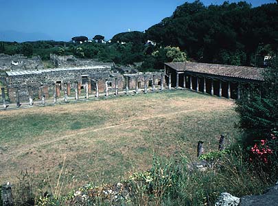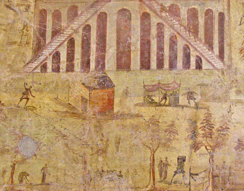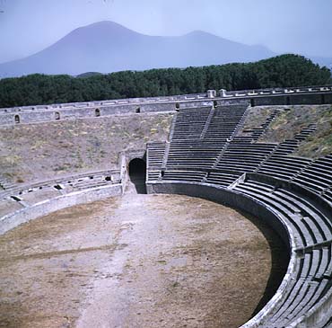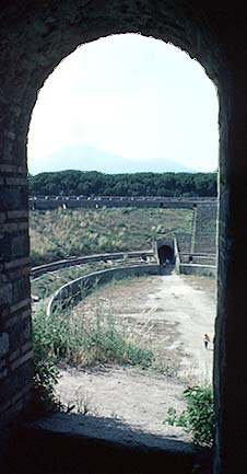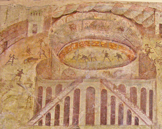 Gladiatorial contests, like chariot races, were originally held in large open spaces with temporary seating; there is evidence that some munera were held in the Roman Forum, for example. As the games became more frequent and popular, there was need for a larger and more permanent structure. Although the Circus Maximus was often pressed into service because of its huge seating capacity, the Romans eventually designed a building specifically for this type of spectacle (called an amphitheatrum because the seating extended all the way around the oval or elliptical performance area, which was covered with sand, harena). Early amphitheaters, both in Rome and elsewhere, were built of wood, but stone amphitheaters proved to be much more durable; the oldest stone amphitheater, built in Pompeii in the first century CE and seating approximately 20,000, is still well preserved (see also this view through an archway on the upper level, a section of stone seats with staircase, and the exterior walls with stairway). Like Roman theaters, amphitheaters were freestanding; because they did not require natural hills, as Greek theaters did, they could be built anywhere. A remarkable painting from a house in Pompeii depicts the amphitheater. In the tree-shaded area in front, vendors have set up temporary shops to sell food and drinks; the exercise-ground to the right was equipped with a large latrine so spectators could relieve themselves. This fresco depicts a specific event that took place in 59 CE, when a fight erupted between the Pompeians and the neighboring Nucerians (much like modern soccer brawls); in punishment for the riot, Nero imposed a ten-year ban on gladiatorial fights in the amphitheater.
