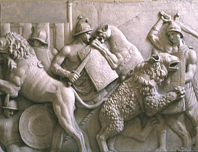 In addition, the Bestiarius (animal-fighter) was a special type of gladiator trained to handle and fight all sorts of animals. The bestiarii were the lowest ranking gladiators; they did not become as popular or individually well known as other types of gladiators. Although this relief depicts bestiarii wearing armor, most depictions show them without armor, equipped with whips or spears, wearing cloth or leather garments and leggings.