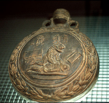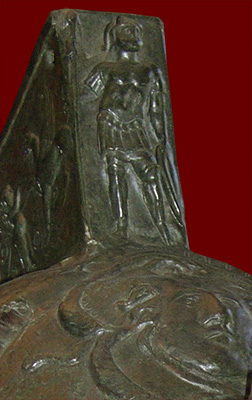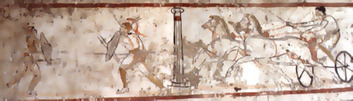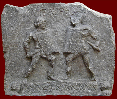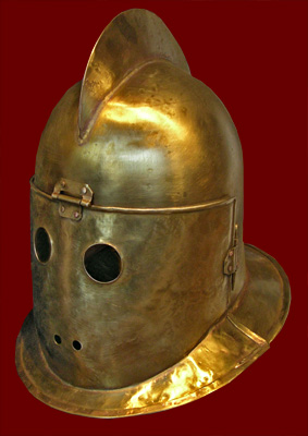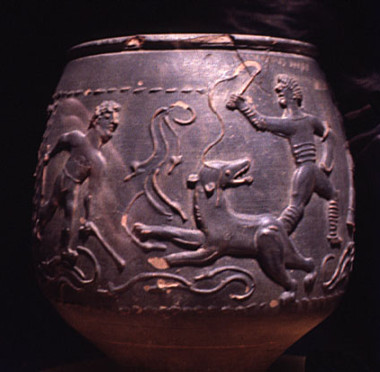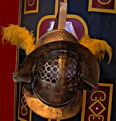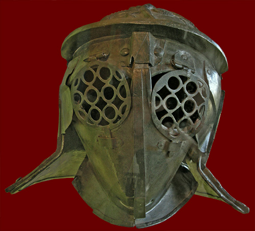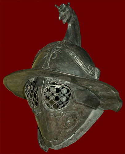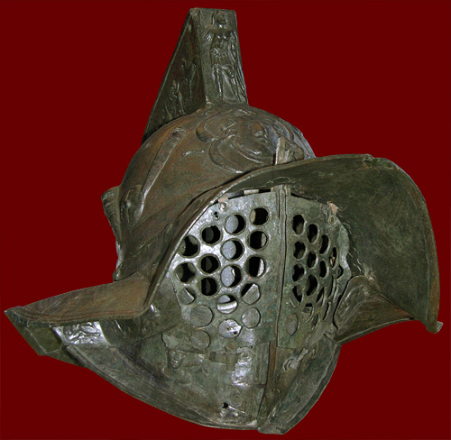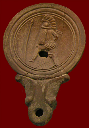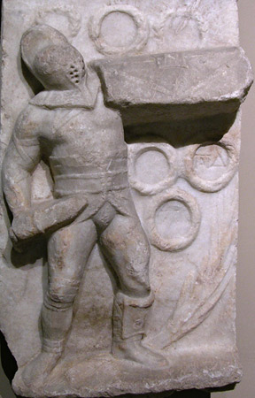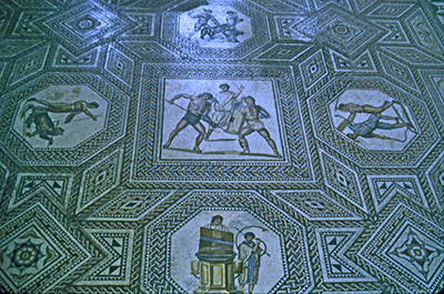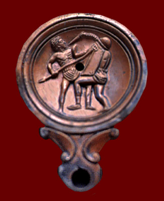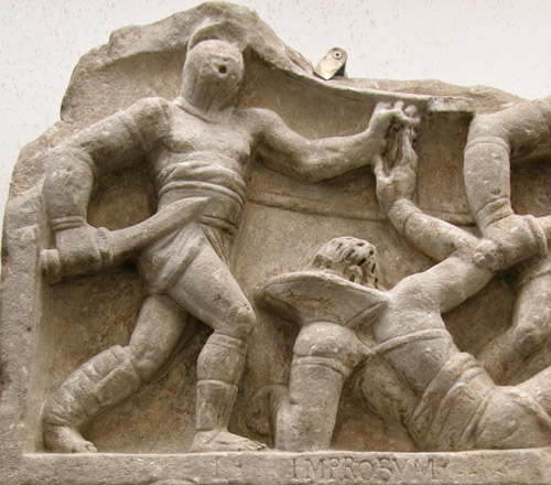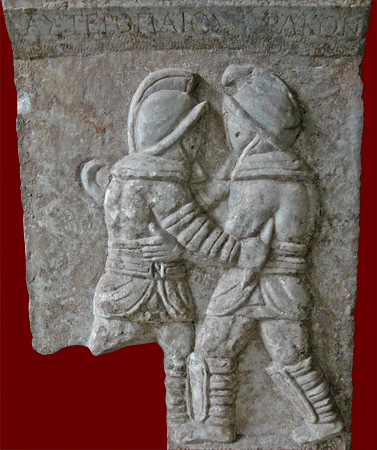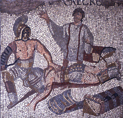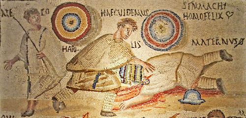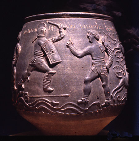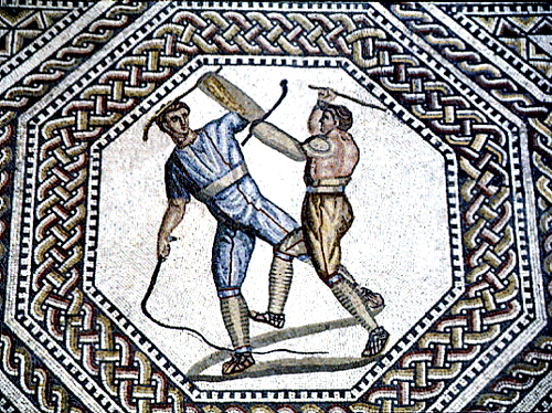 Like chariot racing, contests of gladiators probably originated as funeral games; these contests were much less ancient than races, however. The first recorded gladiatorial combat in Rome occurred when three pairs of gladiators fought to the death during the funeral of Junius Brutus in 264 BCE, though others may have been held earlier. Gladiatorial games (called munera since they were originally duties paid to dead ancestors) gradually lost their exclusive connection with the funerals of individuals and became an important part of the public spectacles staged by politicians and emperors (click here for some modern assessments of the cultural meaning of the arena). The popularity of gladiatorial games is indicated by the large number of wall paintings and mosaics depicting gladiators; for example, this very large mosaic illustrating many different aspects of the games covered an entire floor of a Roman villa in Nennig, Germany. Many household items were decorated with gladiatorial motifs, such as this lamp and this flask.