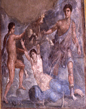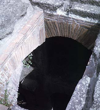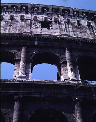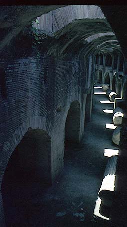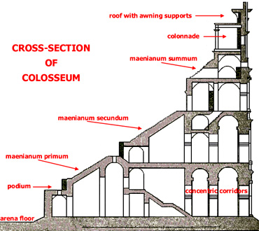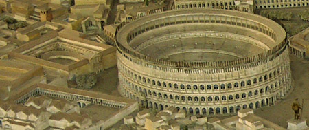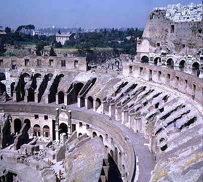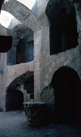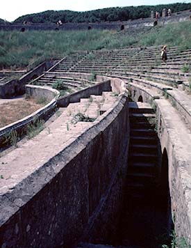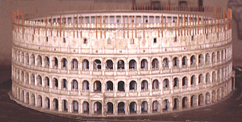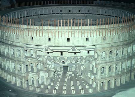 Colosseum: The reconstruction drawing at the top of this page depicts the grandest of all Roman amphitheaters, known in antiquity as the Flavian Amphitheater because it was built by the emperors of the gens Flavia, Vespasian, Titus, and Domitian, and later called the Colosseum, either because of its size of because of the colossal statue of Nero which stood in the vicinity. The inaugural games were held in 80 CE, though construction continued for some time after that. The exterior walls were four stories high, and the first three stories were adorned with half-columns illustrating the three classic architectural styles (Doric, Ionic, Corinthian). Only a small part of the full structure survives (not because it collapsed, though it was damaged by several earthquakes, but because later Italians used the building as a quarry for centuries, stealing the stones to build St. Peter's and many palaces). What remains of the Colosseum today gives no idea of this amphitheaters lavish decorations, such as colorfully painted statues, decorative marble, and painted stucco. This model demonstrates the intact structure, and this cutaway section shows details of the construction, as does this labeled drawing. Looking down at the interior of the Colosseum from the top story gives some sense of its size; estimates of seating capacity vary from 40-60,000, with 50,000 most likely. Because the floor of the Colosseum has not survived, we can see the maze of underground structures, corridors, ramps, animal pens (this image from the amphitheater in Pozzuoli shows what the pens in the Colosseum were like), and rooms for prisoners. This view of amphitheater at Capua illustrates what the floor of the Colosseum would have looked like without the wooden coverings and layer of sand; we can clearly see the rims which held the wooden trapdoors through which animals and men would magically appear and which could be used to produce other special effects. When the trapdoors were closed, this subterranean area must have been very dark and frightening, echoing with the roaring of caged animals and the cries of prisoners awaiting execution in the arena (see, for example, this image from Pozzuoli). The top story of the Colosseum was equipped with posts to which were attached a huge awning that would shield the spectators from the hot sun; this image shows the post holders for this awning. Seating in the amphitheater was arranged by rank, with a special box for the emperor and his family and ring-side seats for senators. Those who had the least political clout, foreigners and women, relegated to the topmost rows. Enjoy a virtual day at the gladiatorial games by visiting the Colosseum in Region III of VRoma, either via the web gateway or the anonymous browser.