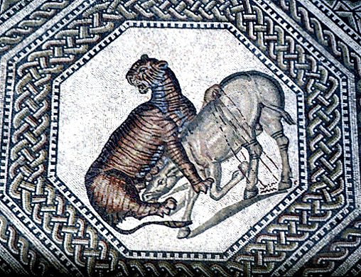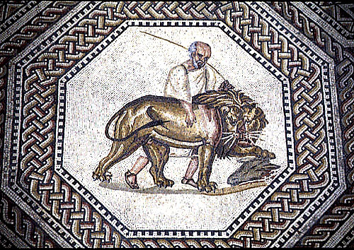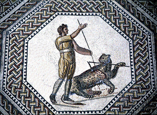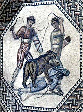 Gladiatorial games began with an elaborate procession that included the combatants and was led by the sponsor of the games, the editor; in Rome during the imperial period, this usually was the emperor, and in the provinces it was a high-ranking magistrate. The parade and subsequent events were often accompanied by music; the mosaic at right depicts a water organ and the curved horn (cornu). The morning's events might begin with mock fights such as this contest. These would be followed by animal displays, sometimes featuring trained animals that performed tricks, but more often staged as hunts (venationes) in which increasingly exotic animals were pitted against each other or hunted and killed by bestiarii (click here for more information about venationes).